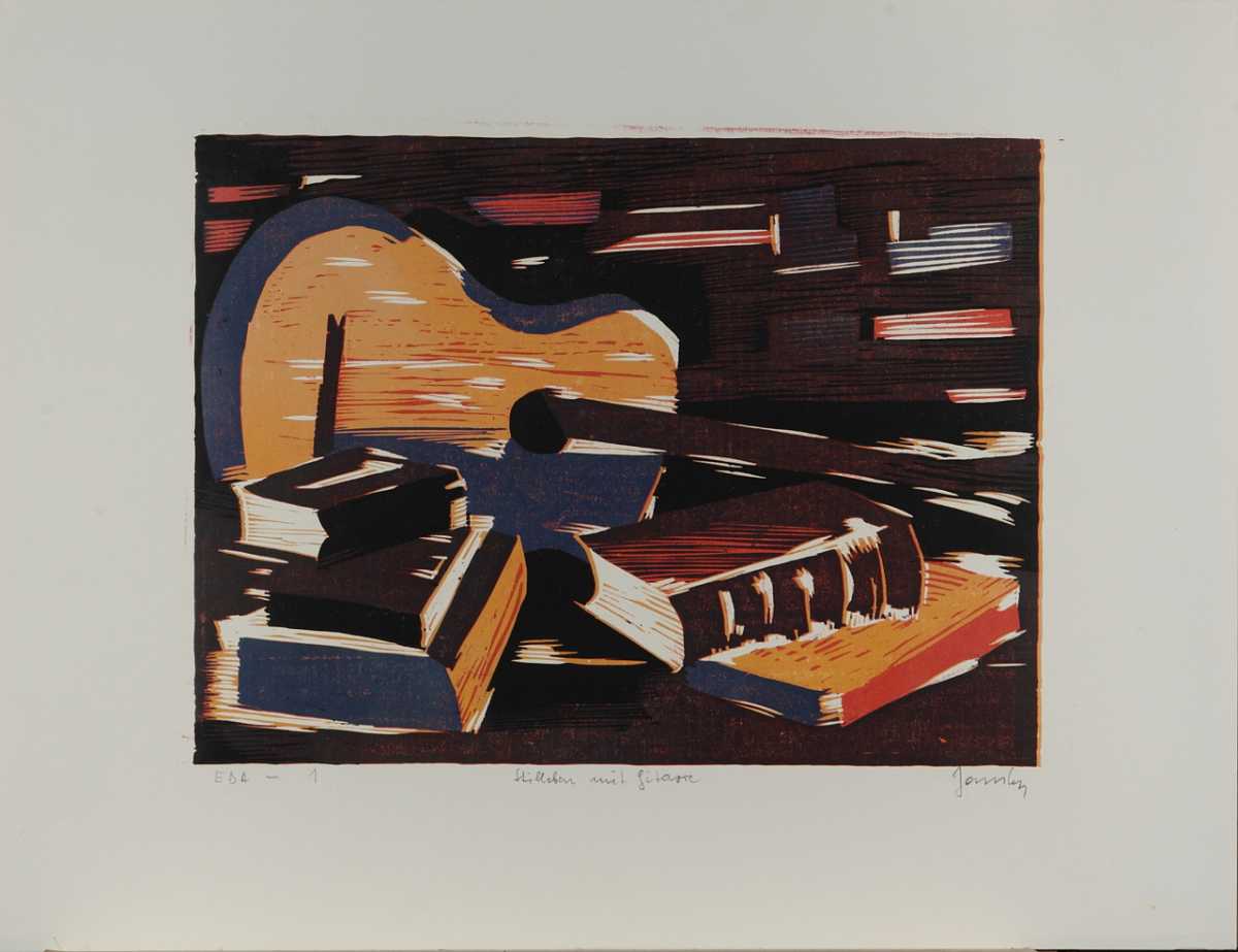 Farbholzschnitt, 50x65, Stilleben mit Gitarre, Nr.: 001
