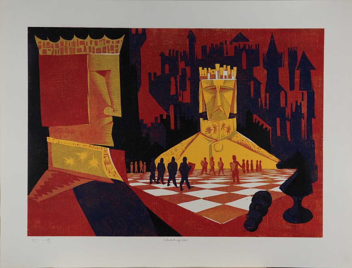 Farbholzschnitt, 65x85, Schachspieler, Nr.: 019
