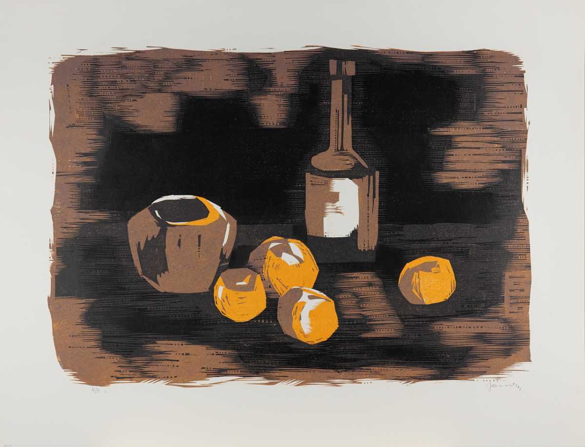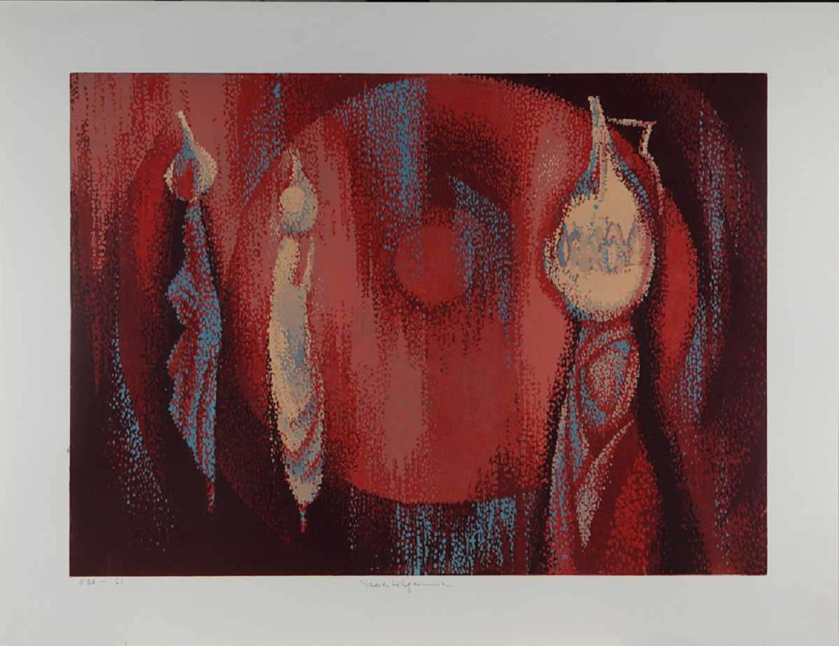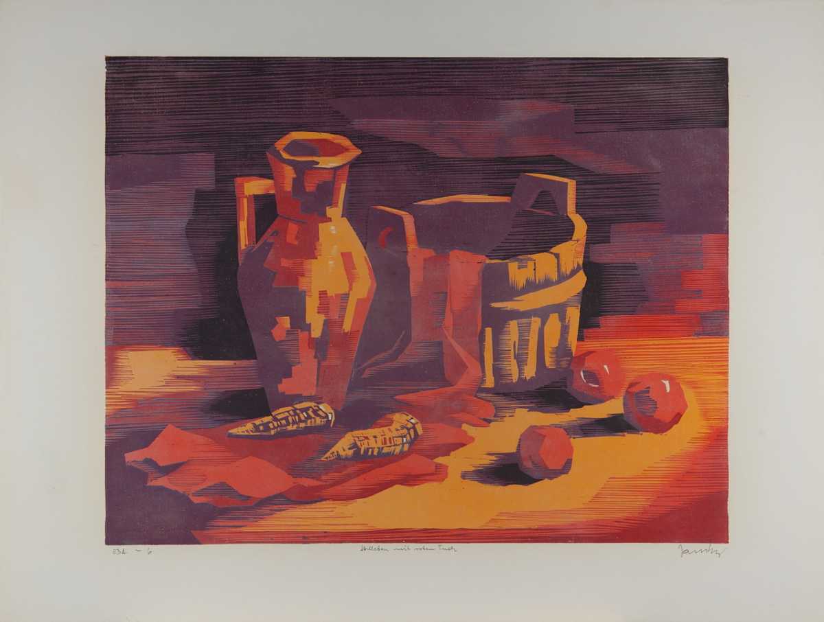 Farbholzschnitt, 65x85, Stilleben mit rotem Tuch, Nr.: 006